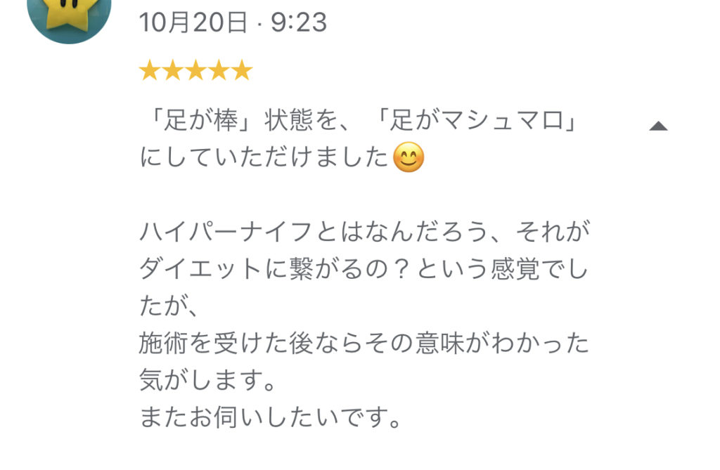 「足が棒」状態を、「足がマシュマロ」にしていただけました。